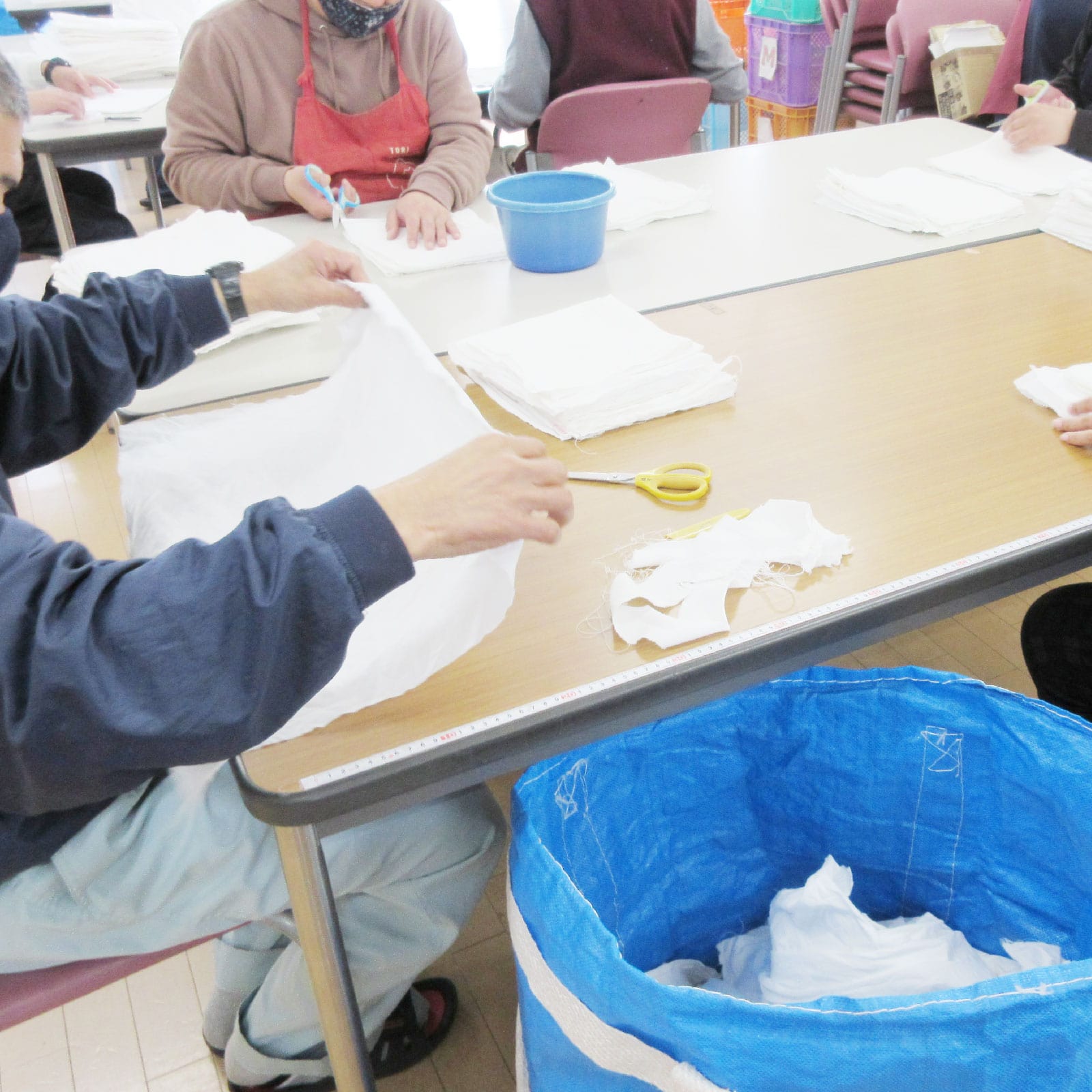 30人ほどの障害を持つ人たちが、古タオルなどを元に、介護施設や工場で使用する拭き取り布(ウエス)を作っています。